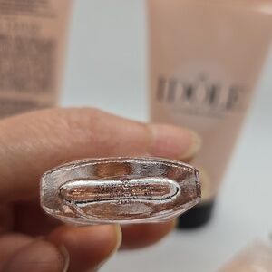 Lancôme Idôle duo. Two peach-pink body creams and two matching mini clear perfume bottles. Elegant and feminine scent set. Great for gifting or travel.