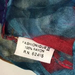 Chic lightweight sheer scarf in blue, red and gold tones. Soft, flowing fabric adds effortless style to any outfit. Versatile accessory for day or evening wear. Easy to drape and layer for polished looks.