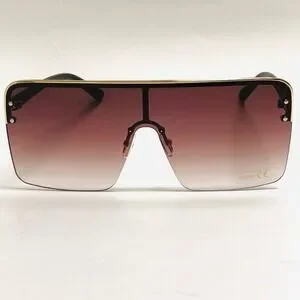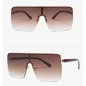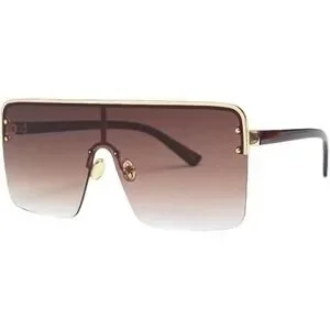 Statement shield sunglasses, a bold accessory that instantly elevates any look. These sunglasses feature an oversized, rimless design with a flat top and a gradient lens that fades from brown to clear. The gold-tone metal frame adds a touch of luxury, while the adjustable nose pads ensure a comfortable fit. Perfect for adding a touch of glamour to a day at the beach or a stylish brunch with friends, these sunglasses are a must-have for any fashion-forward woman.