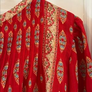 Vibrant red top with intricate patterns. Ideal for casual wear.