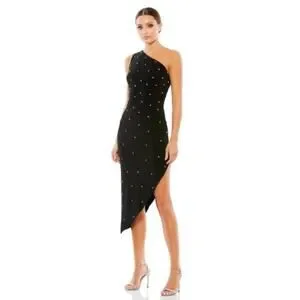 Mac Duggal “Midnight Sparkle” Rhinestone One-Shoulder Asymmetrical Black Midi Dress US 12 NEW