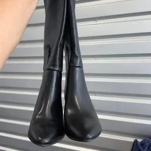 Classic black tall boots with a sturdy block heel. Smooth faux-leather finish for a sleek, modern look. Versatile style that pairs easily with dresses and denim. Comfortable heel height for all-day wear.