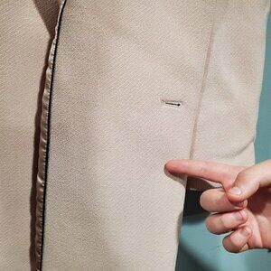 There are 2 light stains on the inside left lapel. They are both noted in the photographs, they are on the inside and not visible when the coat is worn. I did have the coat dry cleaned and was not satisfied with the two stains inside the lapel, so it was dry-cleaned a second time. Unfortunately the light stains did not come out.