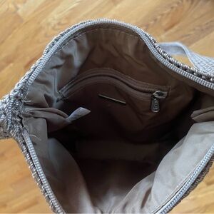 Textured woven exterior with metallic zipper pull stamped THE SAK. Compact pouch for essentials. Neutral brown shade complements many looks.