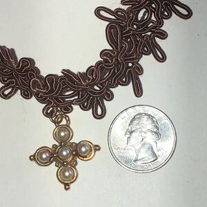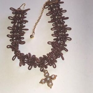 Brown Lace Choker Necklace with Faux Pearl Cross Pendant
