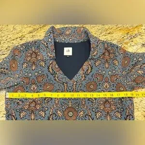 The Cabi Provincial Tunic Dress in women's size Small XS is a stylish and versatile piece perfect for casual occasions. The dress features a beautiful blue and brown floral pattern on a polyester fabric, with long button cuff sleeves and a collared neckline for a chic look. It is lined for added comfort and has a pullover closure for easy wear. The dress falls to a short length, making it suitable for all seasons, and can be machine washed for convenient care. With its modern shift and tunic style, this CAbi dress combines fashion with functionality for a timeless addition to any wardrobe.