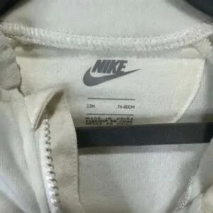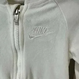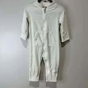 This adorable Nike baby girl velour coverall is a one-piece outfit in a lovely 'Sail' (off-white) color, perfect for keeping your little one cozy and stylish. Made from soft velour fabric, it features a full-zip front for easy changing and a convenient front pocket. The iconic Nike logo is subtly embroidered on the chest. This coverall is in excellent, gently used condition, with no visible stains or holes, making it ready for its next adventure.