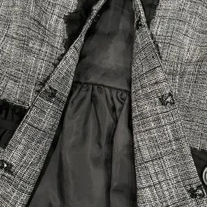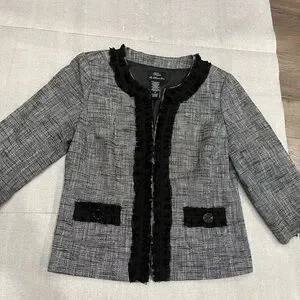 Stylish gray tweed jacket with black trim. Features button details and a classic design.