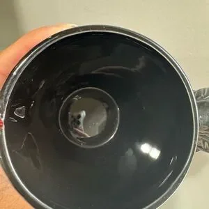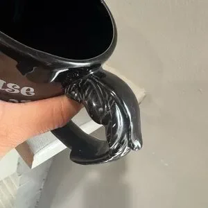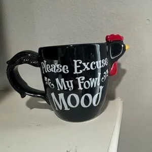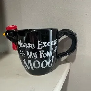 Adorable Cracker Barrel chicken-shaped mug in black stoneware featuring the funny phrase: