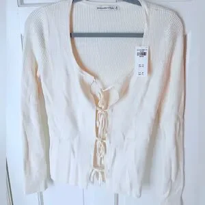 Abercrombie & Fitch Cream Ribbed Tie-Front Long Sleeve Cardigan