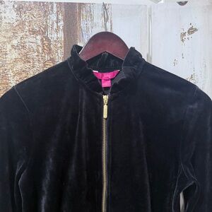 β¨ Luxe comfort meets timeless Lilly style β this Jayla Velour Set in rich Onyx Black includes both the Ruffle Zip Jacket (size Small) and matching Jayla Velour Pants (size XS). Crafted from soft stretch velour (94% polyester, 6% spandex) with gold hardware and signature logo details. Perfect for lounging, travel, or holiday looks.