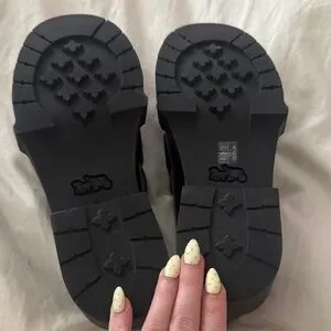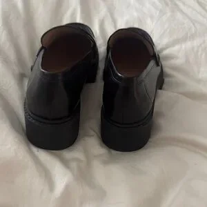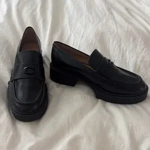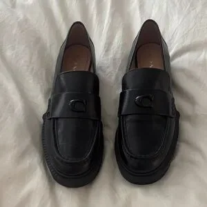 Sleek black leather loafers with a raised Coach 'C' on the strap. Low-profile stacked sole for everyday wear. Smooth rounded toe and classic penny silhouette. Clean stitching and subtle shine on the leather.