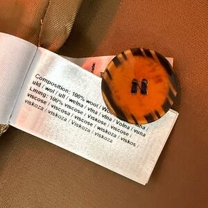 100% wool, nice lining. Size 36, fits a small. I’m 5’2 and it runs long everywhere, would recommend to 5’5+.