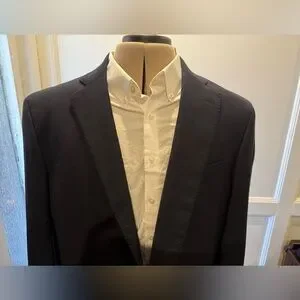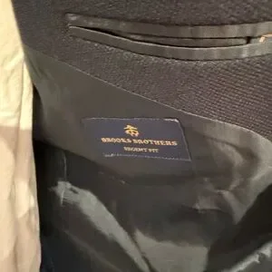 Brooks Brothers tailored single-breasted blazer. Notch lapel and two-button front. Flap pockets and classic silhouette. Versatile for business or dress occasions. No alterations have taken place on this.