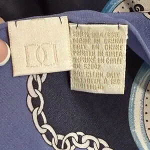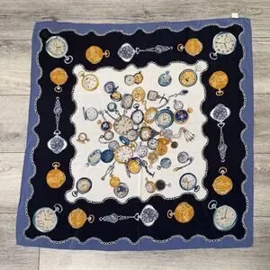 Beautiful Liz Claiborne silk scarf featuring an elegant pocket watch and chain print in classic navy, gold, and blue tones. Timeless design that pairs perfectly with both casual and polished looks.