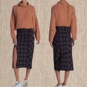 Chic plaid midi skirt with side slit. Elegant and versatile design.
