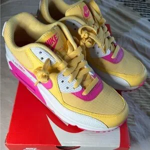 Vibrant yellow textile upper with bright pink accents and white leather overlays. Visible Air Max cushioning for comfort. Secure lacing and durable rubber outsole. Playful color way, worn once.Excellent used condition with original box