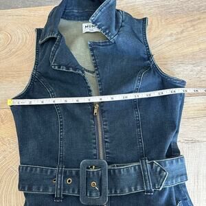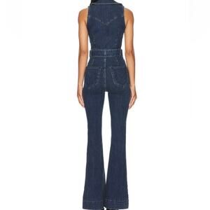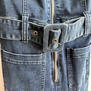 70s sexy statement denim jumpsuit, Removable belt, zip front, pockets, flare leg