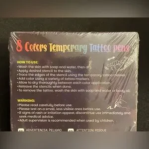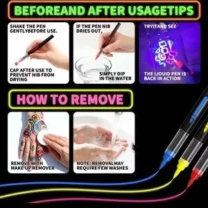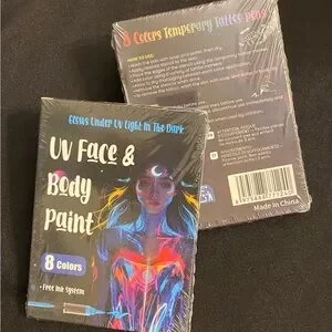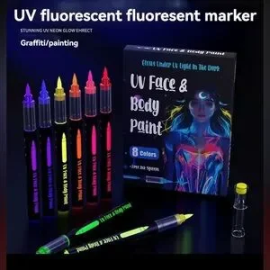 So much fun! 8-piece UV fluorescent face and body paint marker set lets you or your kids show off their wild side. Bright neon ink in vivid shades. Ideal for body art, festivals, and glow effects on clothing. Can be used on paper and ceramics. Clear caps and slim marker bodies allow for precise application.