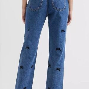 Straight-leg denim with scattered velvet black bow appliqués. Mid-blue wash. Feminine bow details. Clean hem and classic five-pocket style.