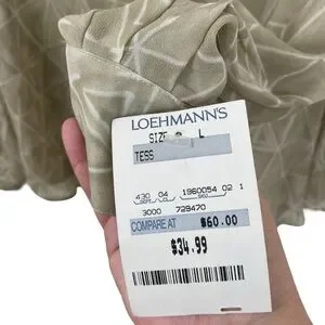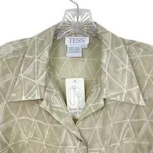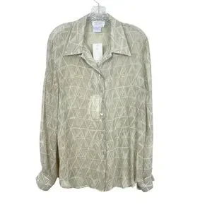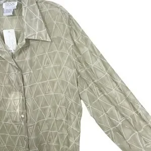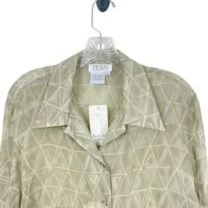 Vtg 90s NWT Tess 100% Silk Button Down Blouse Green Beige Semi-Sheer Size L