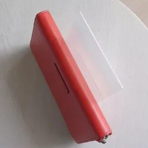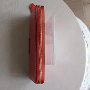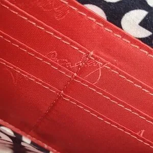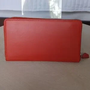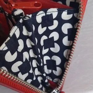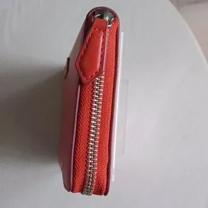 This is an attractive Vera Bradley faux leather accordian-style, zip around wallet in Coral Red. Inside are three separate sections. The front section has 6 card slots, a bill pocket and a clear ID window. The middle section is a zippered coin pocket. The third section features 6 additional card slots and a bill pocket. The wallet measures approximately 7.5" long x 4.25" high. Pre-owned and in very nice condition. As you may note, there are slight indentations in the faux leather which I have found to be typical of this type of VB wallet. Clean, smoke free home.