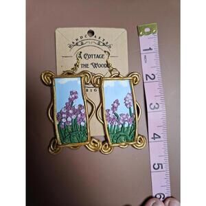 Handcrafted Polymer Clay Floral Painted Earrings with Gold Frame. Beautiful handcrafted earrings featuring a floral design with purple flowers and green stems against a blue background. Each earring is framed with an ornate gold border, adding a touch of elegance. These are one-of-a-kind and unique.