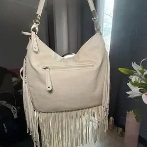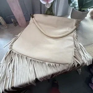 Soft cream leather shoulder bag with stylish fringe detailing. Lightweight and versatile for everyday wear. Clean, minimalist silhouette with a braided handle accent. Neutral cream color pairs easily with any outfit. Beautiful bag minor tiny stain - I am it a bag cleaner nor do I ever touch the bag. This is a beautiful bag again and well made. Please look at all photos and ask any questions. There are no returns. Also if you bundle with me you save! Please send your price for bundling and get you a great deal! Happy shopping!