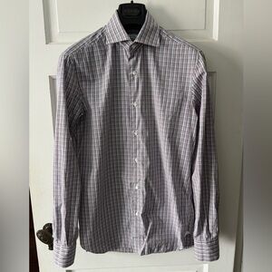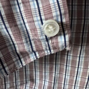 Lots of hand-sewn details on this shirt including button holes and stitching reinforcements, but most elegantly, the arm holes. Thick mother of Pearl buttons and spare at bottom. Fine cotton plaid. One of Kiton’s lesser known brands.