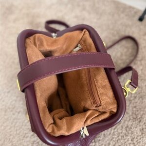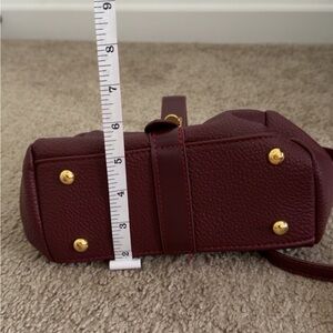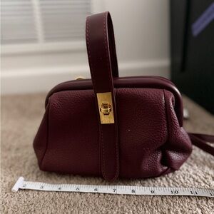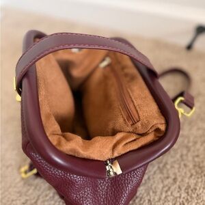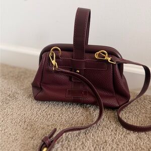 Stylish burgundy pebbled leather crossbody with polished gold-tone clasp. Soft, structured silhouette for everyday wear. Adjustable strap for comfortable hands-free carrying. Sleek design that pairs well with casual and dress looks.