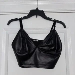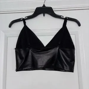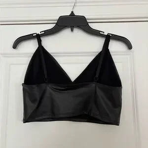 Black faux leather cropped bralette with thin adjustable straps. Structured cups and sleek finish. Versatile styling for layered looks.