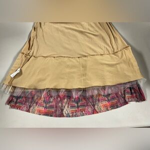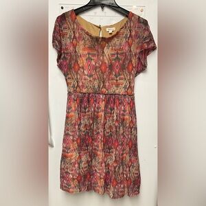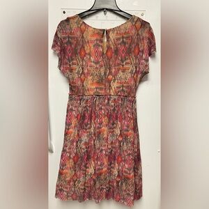 Lightweight casual dress in a pink and brown Aztec-inspired print. Soft, breathable fabric for comfortable all-day wear. Elasticized waist creates a flattering silhouette. Versatile style that pairs easily with sandals or boots.