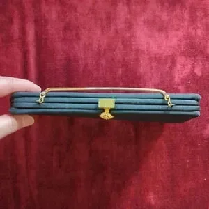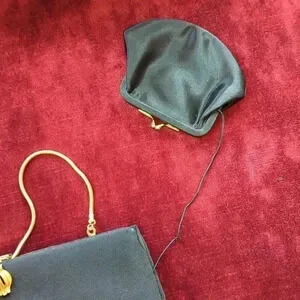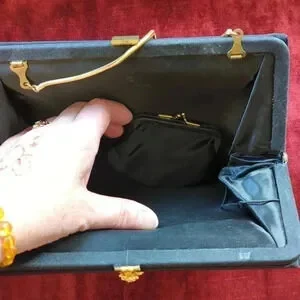 Stylish and classy 1960's evening bag. The clasp has tiny jeweled flowers with all its jewels. Inside is a cute little change purse for your pin money on a cord so it doesn't get lost. The handle can be in or out for day use or going to the show in the evening. The gold metal handle is a soft serpentine style. This purse was my Grandmother's.