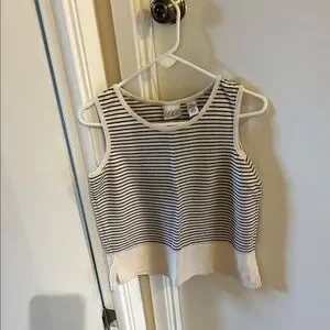 Classic sleeveless knit tank with navy stripes on a cream base. Soft, breathable fabric for easy all-day wear. Clean crew neckline and a relaxed, slightly cropped fit. Pair with high-waist jeans or layered under jackets for a polished casual look.