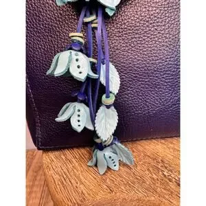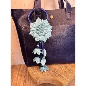 Leather Flower Purse Charm Genuine Leather Blue Mum Dahlia Bag Charm NeW!