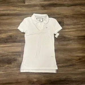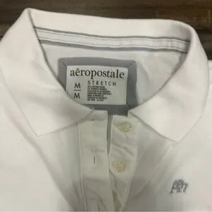 Classic Aeropostale white polo top with a clean collared neckline. Soft, breathable fabric for all-day comfort. Slim, flattering fit with short sleeves. Versatile white color pairs easily with any outfit.