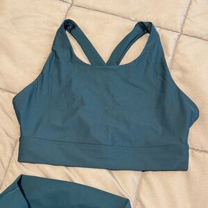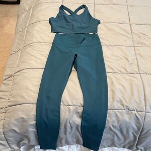 Stylish teal leggings with matching top. Perfect for workouts. Comfortable and flexible fabric. Sports Bra Medium Bottoms Small. EUC