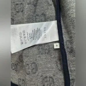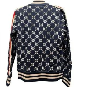 Stylish navy zip-up hoodie featuring the iconic GG logo pattern. Red and cream stripes on the sleeves add a bold touch.
