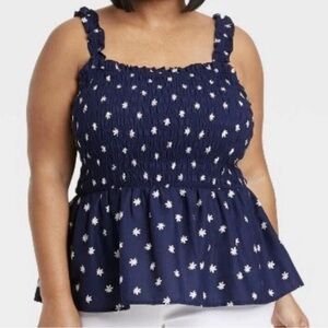 Ava Viv, plus size, 1X, navy, daisy, floral print, smocked, peplum, tank top, womens, boho chic, cottagecore, coquette, romantic, feminine, stylish, modern, vintage style, effortless, casual, cute, spring, summer, vacation, resortwear, everyday, bohemian, relaxed fit, flattering, breathable, XXL, 2X, sleeveless, navy blue, wildflower, ditsy floral, babydoll, girlcore, prairie, sun top