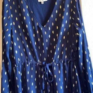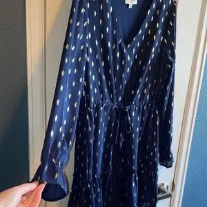 Chic navy dress with subtle gold accents. Ideal for versatile styling.