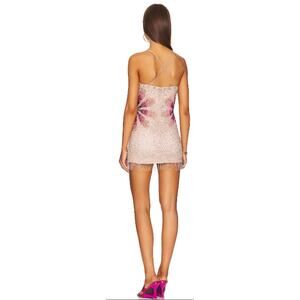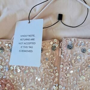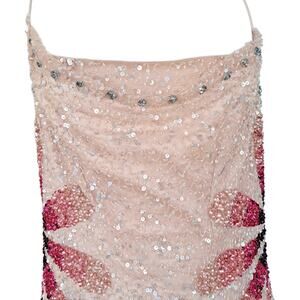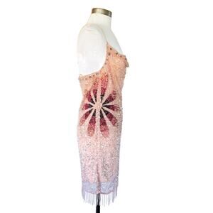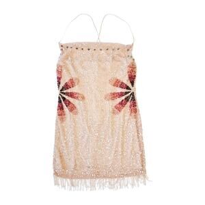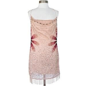 Sparkling pink mini dress with sequin embellishments. Features spaghetti straps and fringe hem. Perfect for a night out.