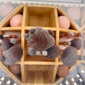 Beautifully designed bamboo cosmetic carousel featuring a full 27-piece makeup brush set plus storage for sponges and accessories. The rotating organizer keeps everything visible, accessible, and neatly displayed—perfect for vanities or makeup stations.