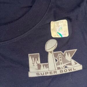 Official Nike tee featuring a reflective Super Bowl LX front graphic. Simple crewneck silhouette. Clean team-themed design with NFL hologram detail. Comfortable cotton blend feel. Great for game day wear.
