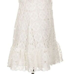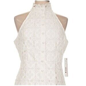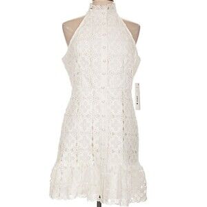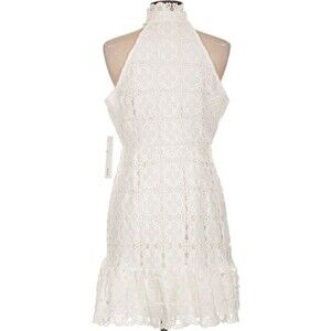 This designer Aqua white lace halter neckline ruffle hem sleeveless dress in size large is a perfect choice for various occasions such as travel, weddings, parties, and formal events.