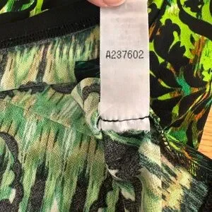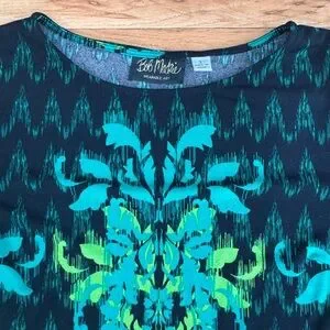 ***Bob Mackie is known for creating "wearable art" pieces, which often feature bold, imaginative, and colorful prints like the leaf pattern seen on this top