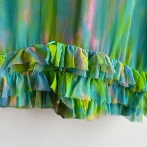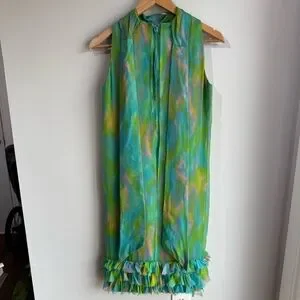Vintage 60s Irving Nadler Watercolor Shift Dress S/M Green Sleeveless Ruffle Mod