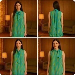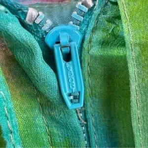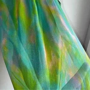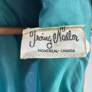 Great condition for her age. A few small holes/nicks in the front, and discolouration at the neck. Overall in really great shape. Beautiful colours! Features a high neck with long chiffon ties at the neckline that can be styled in a bow, left to drape dramatically, or wrapped for a modern scarf effect. Lined. Ruffle at the hem. Made in Canada.