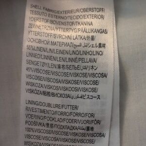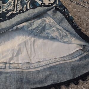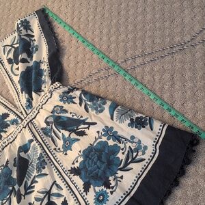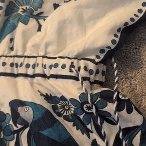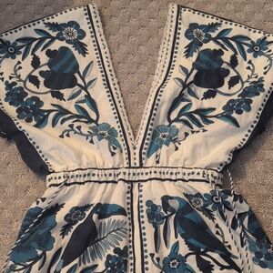 Blue and white linen tropical printed dress with deep v neckline elastic waist that can be cinched and tied with beaded ties