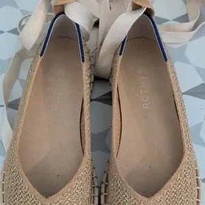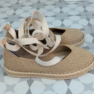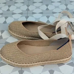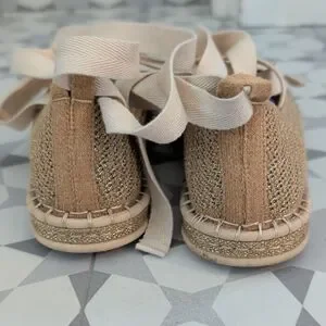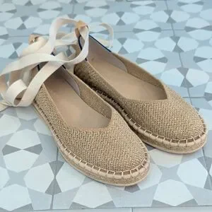Lightweight woven espadrille flats in beige with ribbon ankle ties. Soft knit upper offers flexible comfort and subtle texture. Cushioned footbed for everyday wear. Neutral beige pairs easily with summer and casual outfits.