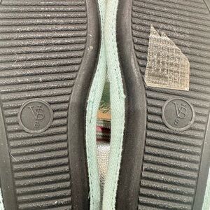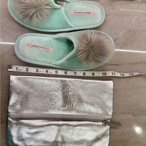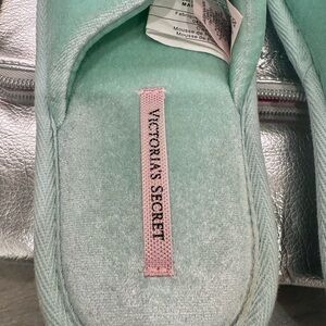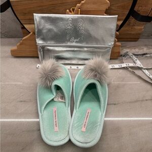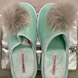Indulge in the luxurious comfort of these Victoria's Secret slippers, crafted in a plush green fabric adorned with elegant gray pom-poms. The open-toe slide design and cushioned footbed offer a cozy and stylish experience, perfect for unwinding at home.